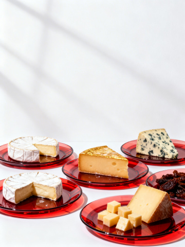 纯白背景上,以高清写实风格展示6款不同烘焙食品的系列素材集合,规整排布成两行三列。每款食品均具有细腻的纹理、金黄诱人的色泽和自然的光影效果:左上角是表面撒有白色糖粉的圆形丹麦酥,右上角是夹着草莓果酱的方形司康饼,中间上方是顶部呈网格状的圆形芝士蛋糕,左下角是表面有交叉纹路的长条形碱水面包,右下角是点缀着巧克力豆的圆形麦芬蛋糕,中间下方是层次分明的三角形牛角包。所有烘焙食品保持统一的高光泽质感和立体感,整体构图平衡对称,展现出专业食品摄影的精致与美味。