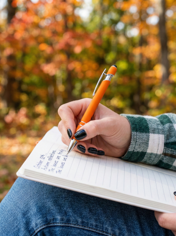 一个正在写字/整理文件的人,桌子上有笔记本、文件夹,传达“梳理信息、准备素材”。