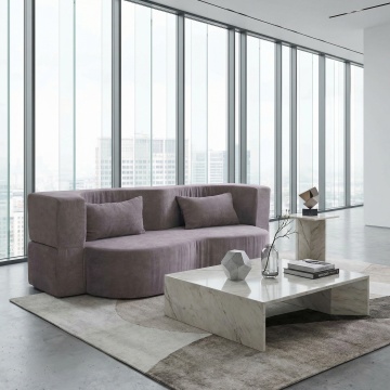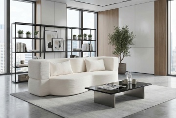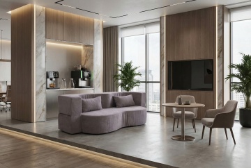 俯瞰视角,极简主义风格客厅以深邃的墨黑与温润的原木色为基调,倾斜45度的构图展现出几何切割般的空间层次感。清晨的冷蓝色光线从整面无框玻璃墙斜射而入,在深灰色微水泥地面上投下窗格的几何阴影,窗外是被薄雾笼罩的城市天际线剪影。中央悬浮着一个由黑色金属框架与烟熏玻璃台面构成的不规则多边形茶几,周围环绕着三张浅灰色模块式布艺单人沙发,每个沙发配有一个芥末黄皮质靠垫。右侧墙面是整面的胡桃木饰面板,内嵌线性LED灯带勾勒出隐藏式储物空间的轮廓。天花板采用悬浮式设计,中央垂挂着一个由12个不规则玻璃球体组成的艺术吊灯,在地面投射出破碎的光斑图案。空间角落摆放着一株大型琴叶榕,其深绿色叶片与整体冷色调形成鲜明对比。地面铺设着一块巨大的米白色羊毛手工编织地毯,边缘处有渐变的黑色几何图案。整体氛围呈现出一种冷静的奢华感,光线在不同材质间的反射创造出丰富的视觉层次,既保留了原空间的通透感,又通过色彩与光影的转变赋予其北欧极简的清冷美学。