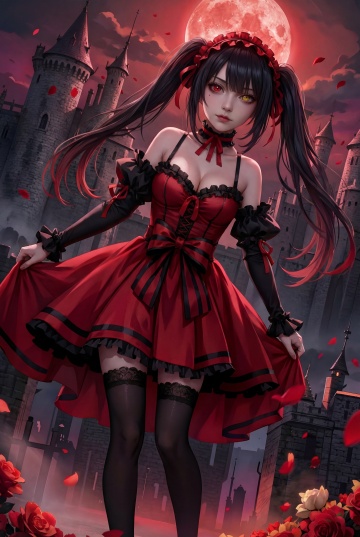 动漫风格插画,一位拥有黑色双马尾、红色眼眸的少女,变换造型为身着深蓝色与金色相间的洛丽塔裙装,手持镶嵌蓝宝石的权杖,背后展开带有金色纹路的深蓝色羽翼,脚穿深蓝色长筒靴配金色蝴蝶结,周围散落着蓝色水晶与淡紫色云朵状装饰,整体画面保持纯色背景,色彩和谐统一,光影柔和,展现出梦幻而优雅的氛围,线条流畅,细节精致,具有鲜明的二次元动漫美学特征。