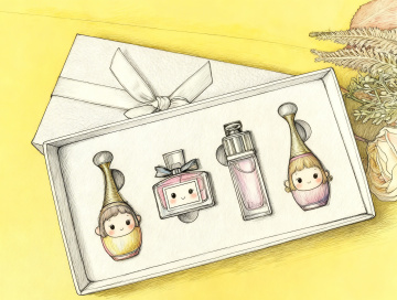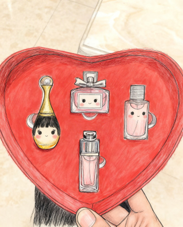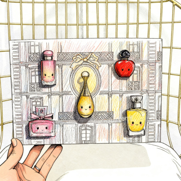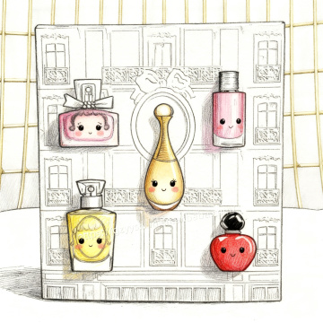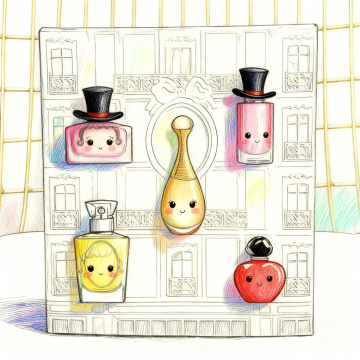 手绘插画风格的香水系列海报,六个完全不同样式的香水瓶规整排布,保持原香水瓶的基本结构但变换元素造型,每个瓶子拥有独特的手绘线条和装饰细节,整体色彩变换为六个不同的纯色背景,每个背景颜色与对应香水瓶的手绘色彩相协调,画面采用平面设计风格,线条流畅,色彩明快,强调视觉层次感和信息传达效率,符合现代香水广告的审美和宣传目的