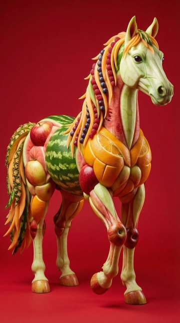 梦幻感与趣味感交织的3D重拟物风马雕塑,以水果拼贴构成超现实粘土质感,节日氛围浓郁。