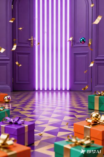 梦幻甜粉礼盒,软3D塑料质感,搭配彩虹与粒子飘散,萌趣可爱风,节日氛围感十足。