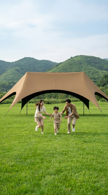 傍晚户外露营场景,白色帐篷下人们围坐在餐桌旁聚餐,帐篷顶部和四周悬挂着温暖的串灯,周围点缀着点燃的蜡烛和灯笼,营造出温馨浪漫的氛围,绿色草坪上散落着舒适的坐垫和靠枕,树木的枝叶在灯光下形成柔和的阴影,整体色调温暖,光影层次丰富,充满自然惬意的露营生活气息。