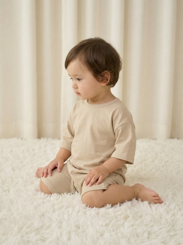 明亮柔和的室内自然光下,一位亚洲婴儿坐在浅色木地板上的白色柔软地垫上,穿着米白色针织连体衣,双手开心地向上举起,脸上洋溢着灿烂的笑容,背景中挂着蓝灰色系的三角旗装饰,整体画面温馨治愈,色调温暖柔和,光线均匀自然,婴儿的皮肤质感细腻,服饰纹理清晰,构图居中,展现出婴儿活泼可爱的瞬间。