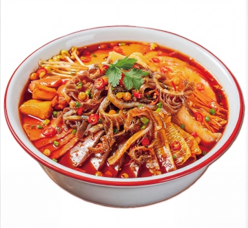 重拟物风呈现热辣沸腾的中式火锅,油光溢彩,蒸汽缭绕,辣椒与牛肚在光影中跃动,质朴木桌衬托实景感,如油画般浓郁。