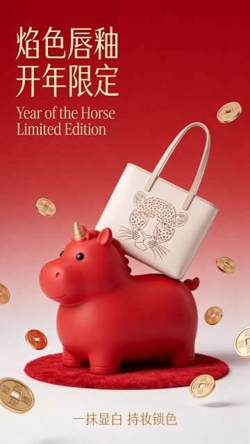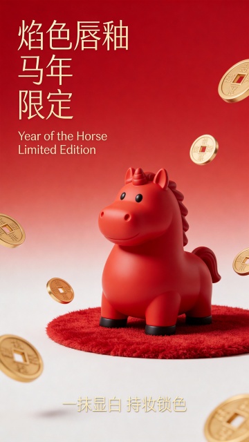 国潮风与软3D结合,红色卡通马与鎏金钱币环绕唇釉,喜庆中式感十足,节日氛围浓厚。