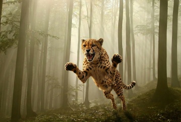 鎏金白虎腾跃于虚拟自然,3D光影交织,粒子流光环绕,神圣威严中透出梦幻奢华,视觉冲击力十足。