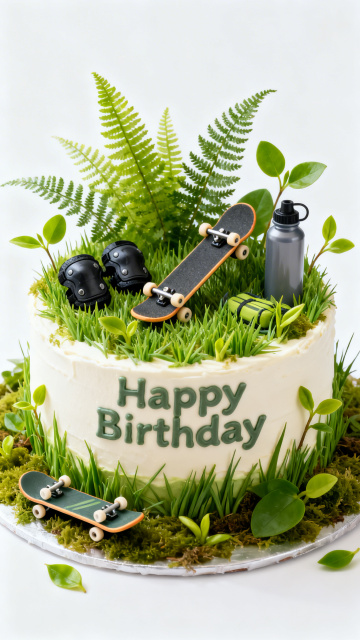 微缩艺术风生日蛋糕,融合粘土质感与重拟物设计,绿意盎然的草植与滑板、护具点缀,营造清新清爽的户外探险氛围,传递自然舒适感。