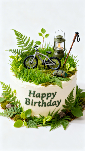 清新自然的微缩森林生日蛋糕,融合粘土风与重拟物设计,3D立体草木环绕山地车、露营灯与徒步杖,传递质朴舒适感,庆祝户外爱好者专属节日。