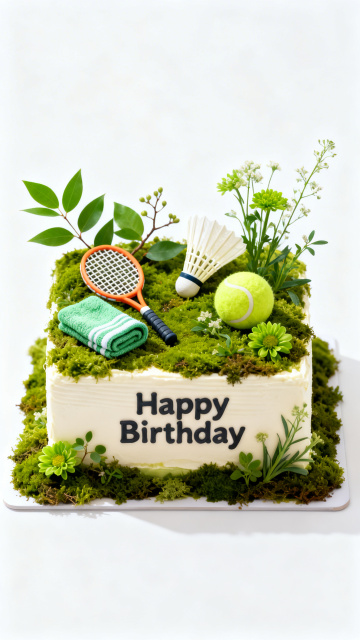 清新自然风生日蛋糕,融合轻拟物与微缩艺术,以粘土质感呈现网球、球拍与绿植,3D立体设计营造舒适户外氛围,传递生机与活力。