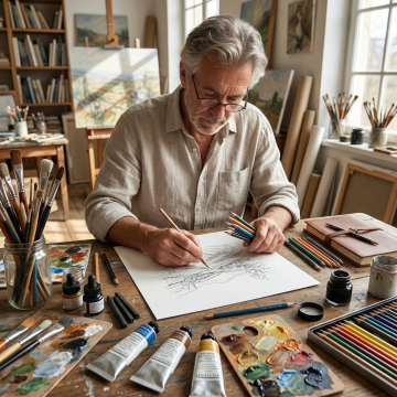 自然光从窗户斜射而入,在浅色墙壁上投下清晰的窗格阴影,营造出明亮通透、宁静舒适的居家办公氛围。一张原木色桌面的书桌,桌面光滑有自然木纹,桌腿为白色简约设计。桌上放置着不同场景和布置:左侧可能是一盆茂盛的绿色观叶植物,右侧是一台打开的银色笔记本电脑,电脑旁叠放着几本不同厚度的书籍,书籍上点缀着一盆小型多肉植物在白色花盆中;或者桌面上是一盏简约设计的台灯,旁边散落着几本翻开的笔记本和一支金属钢笔,桌角可能还有一个小巧的相框或一个复古风格的时钟;又或者是桌面上整齐排列着绘画工具,几支不同型号的画笔插在陶瓷笔筒中,旁边放着打开的颜料盒和一张铺展开的素描纸,角落点缀着一杯热气腾腾的咖啡杯。整体画面采用写实主义风格,色彩以原木色、白色、绿色为主,光影对比柔和,细节丰富,展现出现代简约而不失温馨的不同书桌场景布置。