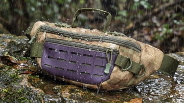 背景是夜晚森林中的地上,一支黑色战术手电筒的特写,一半的体积被雨水浸泡在水中(从地面泼溅而起,激起水花,水花晶莹剔透,折射着光线),背景是森林。