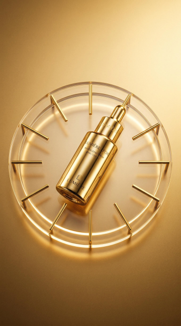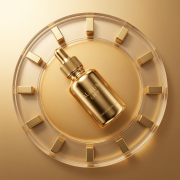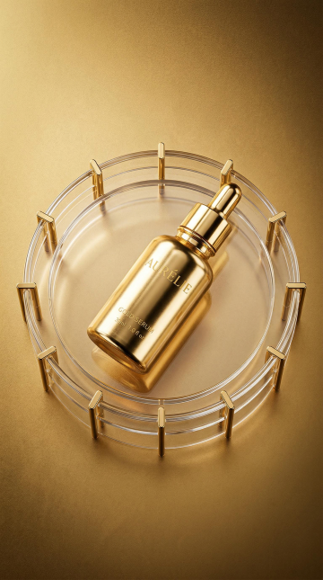 3D重拟物风,鎏金金属质感与奢华优雅融合,科技感瓶身点缀水珠,置于金色贝壳托盘,尽显高端护肤美学。