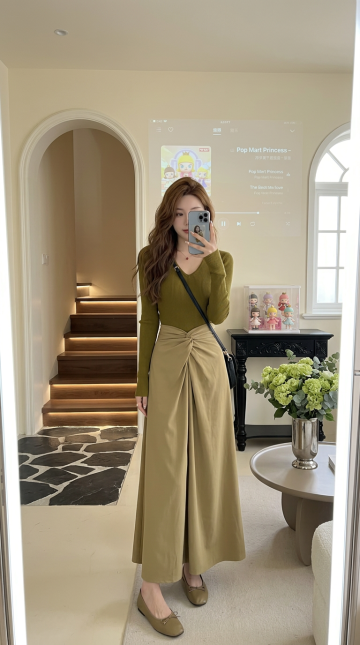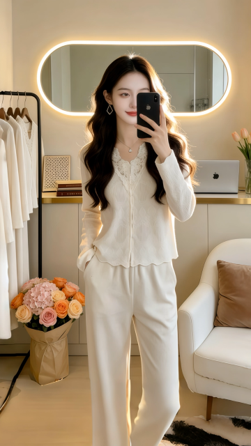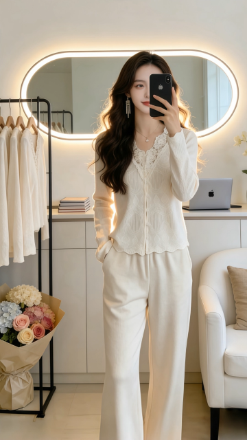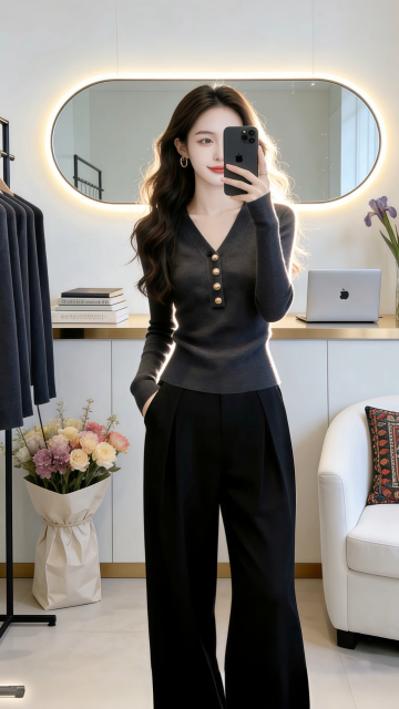 优雅柔光下的商务时尚穿搭,柔和色调与面料质感交织,实景空间营造舒适高级感,展现都市女性的从容魅力。