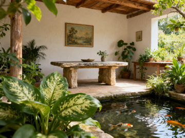 现代简约风格庭院设计,浅灰色木质甲板地面中央摆放着圆形混凝土餐桌,桌上有一盘水果,两侧是木质长椅,背景为白色矮墙,墙前种植着多种绿色植物,包括大型观叶植物和低矮灌木,左侧有高大树木,枝叶呈现绿色与橙黄色渐变,右侧有黑色金属框架木质顶棚,地面铺设白色鹅卵石与灰色石板台阶,整体采用自然光线,光影分明,色调以白色、灰色、木色和绿色为主,营造出宁静、舒适、具有高级设计感的户外休闲空间。