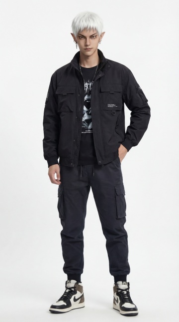 帅哥真人写真,嘻哈风着装,银发蓬松微乱。性格孤僻,整体画面融合高级、复杂元素,暗黑暧昧又带亢奋感,具天野喜孝风格。镜头美学突出,电影质感强烈,以特写捕捉细节,呈现电影级治愈系朦胧高级感,为大师级获奖作品。8K超高清画质,细腻展现真人皮肤纹理,精致丰富。冷色调,35mm 1.4f拍摄,背景华丽装饰,真实光影,完美品质。