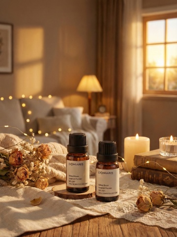 极简主义风格的产品展览场景,柔和的米白色与浅棕色渐变背景,温暖的侧逆光营造出清晰柔和的物体阴影和细腻的高光,两个深棕色玻璃精油瓶带有黑色瓶盖,瓶身贴有简约白色标签和优雅手写体文字,放置在几何形状的米白色展示台上,台面边缘呈现流畅的弧形切割,背景中隐约可见植物叶片投射的自然阴影,整体氛围宁静、高级且富有质感,光线均匀柔和,突出产品的精致细节与材质纹理,无任何文字信息和多余装饰元素。