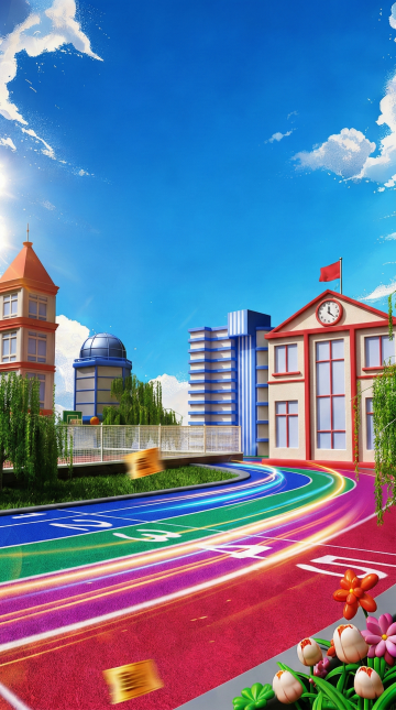 写实风格的常规学校操场高清摄影,画面以红色塑胶跑道为前景,跑道上有清晰的白色分道线,延伸至远方的弯道,跑道内侧是修剪整齐的绿色草坪,左侧是带有蓝色座椅的露天看台,背景有茂密的绿树和一栋多层教学楼,阳光明媚,天空湛蓝,漂浮着几朵白云,光线明亮,色彩鲜艳,具有清晰的光影层次和自然的空间感,营造出积极向上、充满活力的校园氛围。