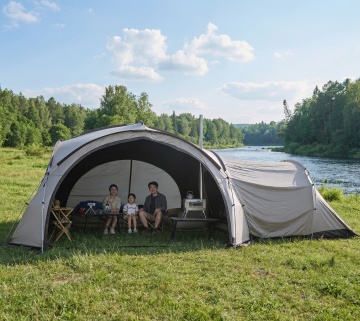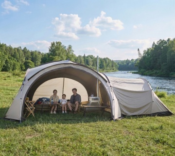 写实摄影风格,阳光透过茂密翠绿的树林洒下斑驳光影,营造出宁静自然的户外氛围,画面下方是修剪整齐的绿色草地,草地上搭建着一个白色尖顶帐篷和一个带有米色遮阳布的露营帐篷,帐篷旁摆放着原木色的折叠桌椅和藤编休闲椅,整体色调以绿色和原木色为主,光影柔和,构图采用自然的三分法,展现出舒适惬意的森林露营场景。