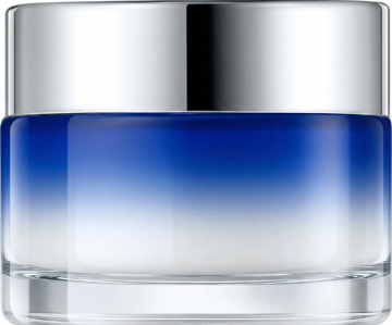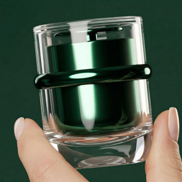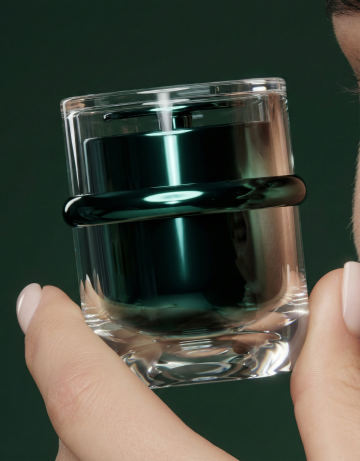 用图片生成效果图,外罩大理石纹理,瓶身上深黄色渐变到青蓝色全透玻璃瓶身,并精修瓶子,4K高清摄影效果