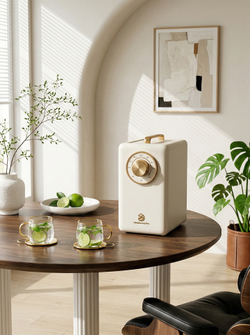 现代感与清新感交织的扁平风插画,结合轻拟物设计手法,展现科技感咖啡机与时尚生活场景,简约主义美学搭配明亮色彩,传递舒适惬意的晨间仪式。