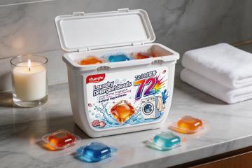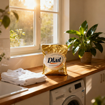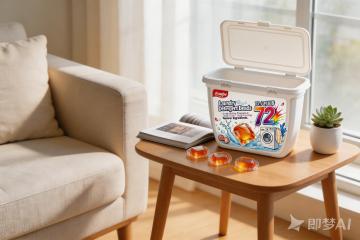 俯视角构图,极简主义厨房场景中央,一台哑光白前置式滚筒洗衣机舱门呈优雅的45度角半开状态,露出内部精密的银色不锈钢内筒与几何排列的波浪提升筋,正面圆形旋钮控制面板镶嵌着冰蓝色LED显示屏,机身侧面的激光雕刻竖纹在斜射的自然光下形成细腻的光影层次。洗衣机静置在深海蓝水磨石地面上,倒映出机身流畅的轮廓线,背景是渐变的冰川蓝哑光墙面,右侧悬挂着由黄铜支架固定的透明玻璃搁板,上面整齐排列着三瓶不同容量的薰衣草香薰洗衣液,液体在光线折射下呈现出淡紫色光晕。整体色调以冷调白与深海蓝为主导,金属部件反射出柔和的高光,营造出兼具专业实验室般的精确感与居家空间的温馨氛围。