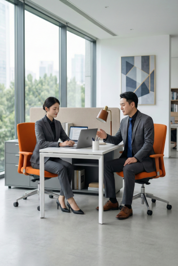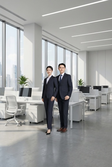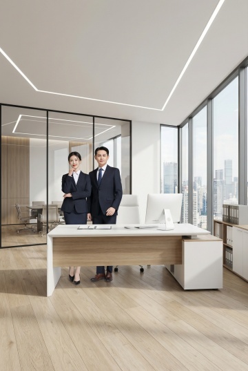 明亮现代的开放式办公室,专业商务人士正在办公桌前专注工作,配备电脑、办公文具和文件,玻璃隔断墙划分空间,白色天花板嵌入方形LED平板灯提供充足照明,灰色地毯地面,角落摆放大型绿植增添生机,整体色调以白色、灰色和蓝色为主,呈现简洁高效、专业有序的职场氛围,不同环境和角度下的办公室背景,光线明亮柔和,空间通透,办公家具现代简约,员工穿着统一深色工装,展现团队协作的工作场景。