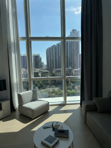 北欧极简风格室内场景,整体以纯白色为基调,搭配温暖的原木色与橙色点缀,明亮通透的空间内,右侧有一个圆形的棕色豆袋沙发,前方地面铺着圆形编织纹理地毯,左侧靠墙设有多层木质搁板,上面摆放着黑色花瓶及干花装饰,背景是带有弧形门洞的白色窗帘,自然光透过窗帘柔和洒入,顶部嵌入式条形灯带与筒灯提供均匀照明,营造出简约、舒适、自然的居家氛围。