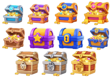 一组Q版卡通风格的宝箱图标,包含八个不同设计的宝箱,分为四对,每对由一个关闭状态和一个打开状态组成。第一对是基础木质宝箱,棕色木板拼接,黄铜锁扣,打开的宝箱内装满银色和金色硬币;第二对是带金属边框的木箱,深棕色箱体搭配黑色金属包边和铆钉,打开的宝箱中盛满金黄色金币;第三对是银白色金属宝箱,表面有菱形和几何花纹,打开后露出大量金币和少量彩色宝石;第四对是带有紫色花纹的银白色宝箱,装饰有卷曲花纹和紫色菱形图案,打开的宝箱内装满金币和各色宝石;第五对是华丽的金色宝箱,红色内衬,金色边框上有复杂花纹和心形装饰,打开的宝箱中堆满金币、彩色宝石和珍珠项链。所有宝箱均采用鲜艳明快的色彩,边缘有清晰的黑色描边,造型圆润可爱,立体感通过简单的明暗色块区分,整体风格统一,适合作为游戏内道具图标使用,背景为纯白色。