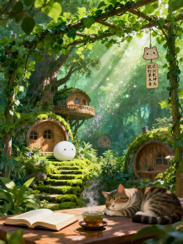 梦幻森林中的童话小屋,水彩风与粒子光效交织,猫儿静眠茶香氤氲,光影斑驳间透出清新温馨的动漫插画感。