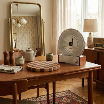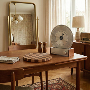 北欧简约写实风设计,白色蓝牙音箱与原木茶几、暖调居家环境结合,营造治愈松弛的居家氛围