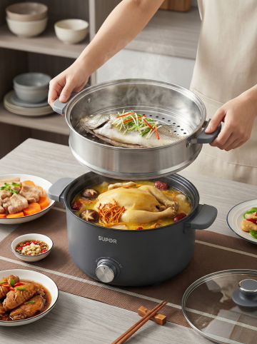 米白色电饭煲,周围环绕厨房台面及新鲜食材(白米、稻穗、绿叶蔬菜),现代简约风格,温馨自然氛围,明亮柔和光线,高清质感,白色背景的要求,