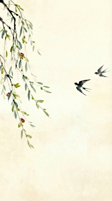 水墨风与工笔结合,柳枝鎏金点缀,飞鸟掠过朦胧山水,清新柔和,尽显中式意境之美。
