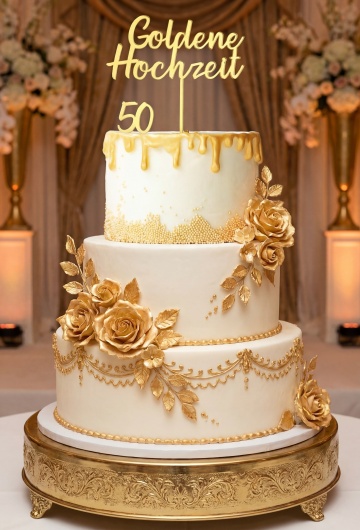 白色背景上,金色闪光粒子组成流畅飘逸的波浪线条造型,粒子大小不一,呈现出细腻的渐变层次感,整体画面轻盈灵动,闪耀着温暖的金色光芒,无文字及其他元素干扰。前景中间放放置一个巨大的三层高生日蛋糕