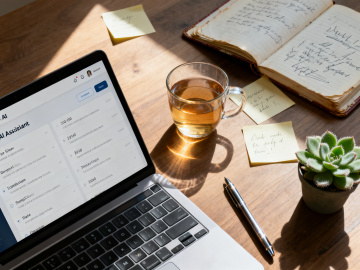 一个正在写字/整理文件的人,桌子上有笔记本、文件夹,传达“梳理信息、准备素材”。