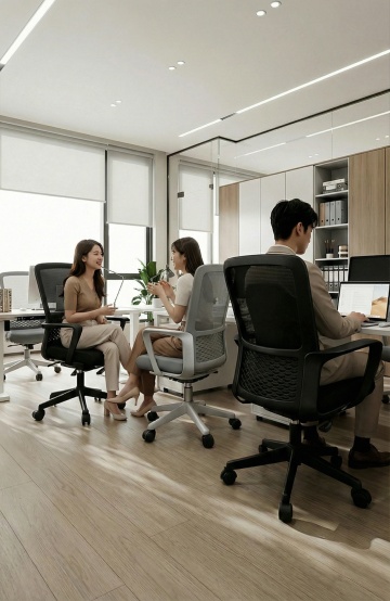 明亮柔和的自然光线下,现代简约风格的办公室环境中,一位穿着黑色西装外套与白色内搭的女性正专注地低头书写文件,棕色中长发自然垂落肩头,桌上放着一杯蓝色纸杯咖啡,周围同事的手臂在前景模糊处形成工作氛围,整体采用浅景深摄影效果,暖色调光线营造出专业而温馨的职场氛围,木质办公桌与黑色办公椅展现出现代办公空间的简洁质感,人物神情专注平和,体现高效协作的工作场景。