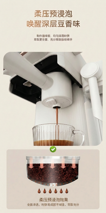 现代感金属风咖啡机,搭配暖黄桌面与绿植光影,融合工业质感与温馨氛围,轻拟物设计展现简约主义美学,传递时尚舒适的生活仪式感。
