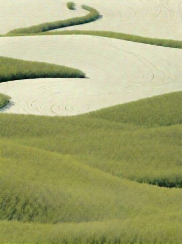 一幅以厚重油画笔刷笔触绘制的自然景观抽象画,画面整体色调改为清新的蓝绿色系,保留了原图中粗犷、富有动感的白色笔触与背景色交融的纹理效果,融入远山轮廓、流动的云彩和水面波纹等自然景观元素,笔触方向和力度营造出自然的韵律感,色彩过渡柔和而富有层次,整体呈现出宁静而富有生机的自然氛围。