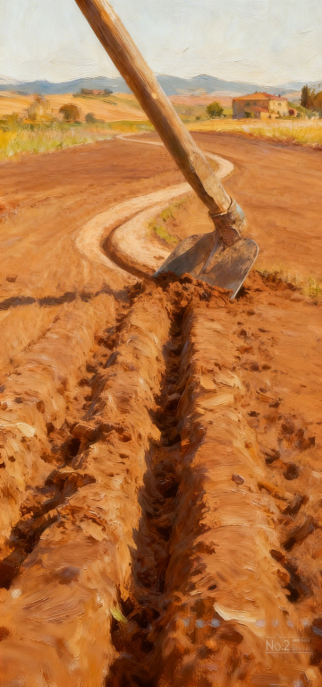 一幅以深邃静谧的靛蓝色与苍翠绿色为主色调的油画,保留了原作中粗犷有力、富有肌理感的厚重油画笔刷笔触,呈现出斜向流动的纹理走向,画面中融入了自然景观元素,如远处朦胧的山峦轮廓、近处点缀的蕨类植物叶片剪影,以及在笔触间隙隐约可见的露珠反光,整体色调从温暖的金色转变为冷调的蓝绿色系,但依然保持了颜料堆叠产生的立体质感和光线在不同笔触角度下折射出的微妙光泽变化,营造出宁静而富有生命力的自然氛围。