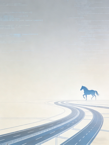 未来感与科技感交织的抽象画面,扁平风剪影马在虚拟现实中的无限公路前行,极简主义风格呈现数字时代的自由驰骋。