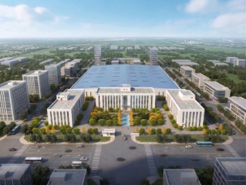现代主义风格工厂建筑,简洁的白色几何体块外观,大面积玻璃幕墙入口,整齐排列的条形窗户,开阔的混凝土广场,道路旁点缀着几棵高大的绿树,晴朗的蓝色天空中飘着少量白云,光线明亮柔和,阴影清晰,整体呈现出干净、专业、高效的工业氛围。
