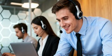 一位戴着黑色头戴式耳机(带麦克风)的男性客服人员,身着黑色修身西装外套(单排双扣,左胸有口袋)和白色衬衫,双手自然交叠于身前,面带温和微笑,站姿挺拔端正。背景为纯浅灰色,光线均匀柔和,人物面部和服装细节清晰,具有高度写实的人像摄影风格,画面简洁专业,突出客服职业形象。