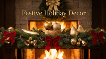 夜晚场景,圣诞节装饰的桌面,桌面上摆放着雪松、松果和红果,中心位置有2个小圆柱蜡烛,旁边有小圣诞树装饰,背景墙壁上挂着一整个完整的圣诞花环,整体氛围温馨浪漫,暖色调灯光照亮场景,细节丰富,画面精致