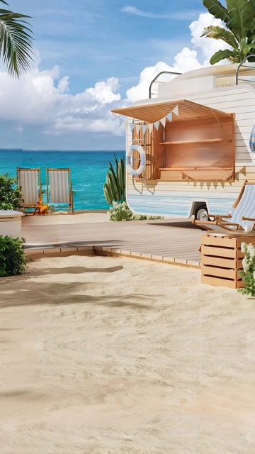 俯视角构图,夕阳将天空染成蜜橘色与薰衣草紫的渐变,三只海鸥掠过波光粼粼的海面,远处热带小岛的轮廓在暮色中若隐若现。近景处,被海水浸润的金色沙滩上,半埋着一个复古条纹救生圈,旁边斜放着一瓶冰镇椰子水,水珠正顺着瓶身滑落,在沙地上晕开深色痕迹。两棵高大的棕榈树倾斜着伸向天空,叶片在风中轻轻摇曳,投下如同舞蹈般的修长影子,海浪温柔地漫过沙滩,留下细密的泡沫蕾丝,空气中弥漫着咸湿的海风与椰子的甜香。