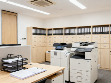 现代简约风格的办公室环境,开放式办公区布局,浅灰色与白色为主的中性色调,大面积落地玻璃窗引入明亮自然光,搭配白色条形吊灯和嵌入式筒灯提供均匀照明,灰色几何图案地毯覆盖地面,白色办公桌配深灰抽屉柜,黑色框架米色坐垫办公椅,办公桌间有半人高白色隔断,角落摆放大型绿植增添生机,金属与玻璃材质的百叶窗隔断,办公桌上配有笔记本电脑和黑色办公电话,整体空间干净整洁、通透开阔,光线充足柔和,营造出专业高效且舒适的工作氛围。