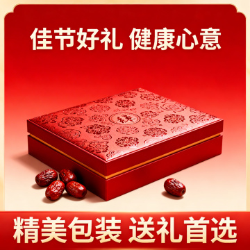 国潮风坚果礼盒,拟人化笑脸由坚果拼成,浮雕云纹点缀,喜庆红金配色,中式元素与现代创意融合,节日氛围浓厚。