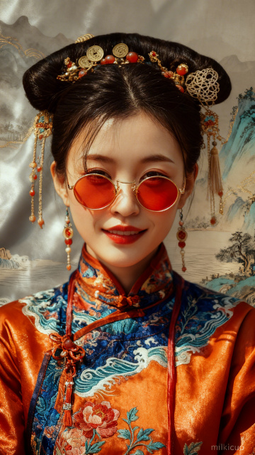 国潮风与蒸汽波融合,古典仕女身着中式旗袍,嵌入精密齿轮与机械钟表,水墨云雾缭绕,仙鹤飞舞,展现传统与科技的诗意碰撞。