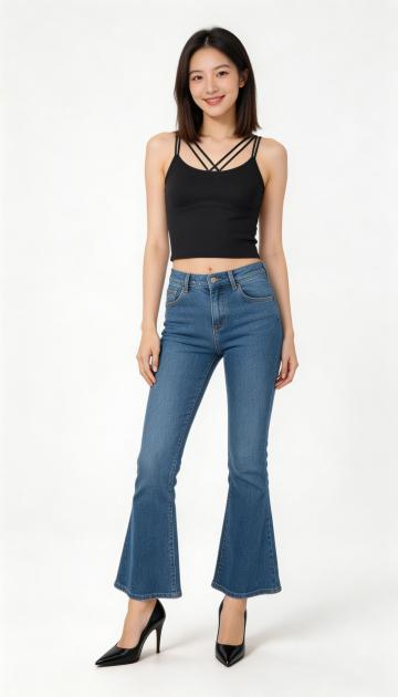 一位年轻亚洲女性的全身人像,人物正面站立,双手背在身后,姿态自然,表情平静。采用高清商业摄影风格,柔和均匀的正面光源,白色纯色背景,画面干净简洁,主体突出。人物展示完整,包括发型、面部表情、身形姿态。穿搭改为简约时尚风格:上身是一件浅灰色的宽松短款卫衣,搭配一条高腰深蓝色直筒牛仔裤,脚穿白色运动鞋,整体休闲舒适,符合日常穿搭展示需求。
