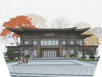 2.5D 图标、可视化风格、中间有主体建筑、周围有附属建筑、 毛玻璃风格、科技蓝、细节简洁、背景透明、智慧城市